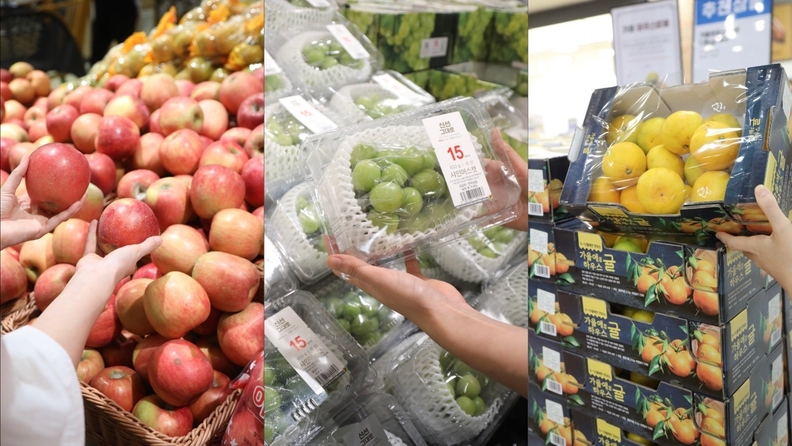 20일에는 '제주감귤(3kg/박스)'과 '타이벡감귤(3kg/박스)'을 각 정상가 1만5,800원, 1만8,800원에서 40% 할인한 9,480원, 1만1,280원에 각각 판매한다. 이마트는 18,19일, 20일 각 하루 판매 물량으로 사과 200톤, 샤인머스캣 120톤, 감귤 180톤으로 총 500톤 물량을 준비했다.