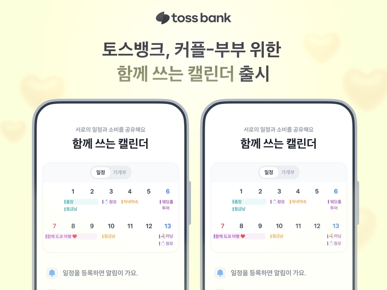 토스뱅크 관계자는 “함께 쓰는 캘린더는 단순한 일정 관리 기능을 넘어, 함께 사는 사람들의 하루와 소비가 자연스럽게 연결되는 생활 속 공유 플랫폼”이라며 “모임통장과 부부통장에 이어, ‘함께 쓰되 더 편리하게 관리하는 금융 경험’을 넓혀가겠다”고 말했다.