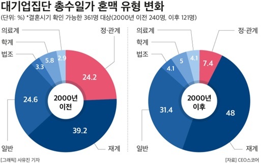 12일 기업데이터연구소 CEO스코어가 공시대상기업집단 81곳의 총수 일가 중 혼맥 정보를 확인할 수 있는 380명을 조사한 결과, 정·관계 혼맥 비중은 오너 2세에서 24.1%였지만, 3세는 14.1%, 4~5세는 6.9%로 크게 감소했다. 반면 재계와의 혼맥 비율은 오너 2세 34.5%에서 3세 47.9%, 4~5세 46.5%로 증가했다. 재벌가가 아닌 일반인과의 결혼 비중도 오너 4~5세에서 37.2%로 확대됐다.
