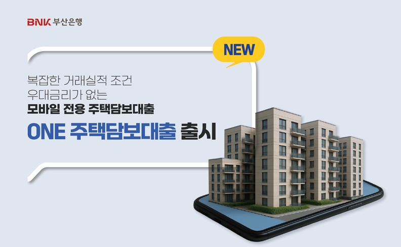 [서울타임즈뉴스 = 최남주 기자] BNK부산은행(은행장 방성빈)은 영업점 방문 없이 모바일뱅킹 앱(App)을 통해 손쉽게 신청할 수 있는 모바일전용 주택담보대출 신상품 ‘ONE주택담보대출’을 출시했다고 12일 밝혔다.