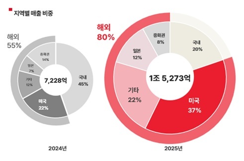 분기 실적 역시 사상 최고치를 경신했다. 2025년 4분기 매출은 5476억 원으로 분기 기준 최대치를 달성했다. 또 같은기간 영업이익은 1301억 원으로 전년 동기대비 228% 늘었다. 특히 해외 매출이 4746억 원을 기록하며 203%의 성장폭을 거뒀다. 전체 매출에서 차지하는 비중도 87%까지 확대돼 글로벌 시장 중심의 성장세가 두드러졌다.
