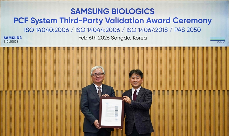삼성바이오로직스는 지난 6일 인천 송도국제도시 본사에서 PCF 시스템 제3자 검증서 수여식을 진행했다. 이번 검증은 노르웨이 소재 글로벌 인증기관 DNV가 수행했으며, 행사에는 유승호 삼성바이오로직스 경영지원센터장(부사장)과 이장섭 DNV 코리아 대표이사 등이 참석했다. DNV는 에너지·제조·바이오·해양 등 다양한 산업 분야에서 국제 표준에 기반한 품질·환경·안전 인증을 제공하는 기관이다.
