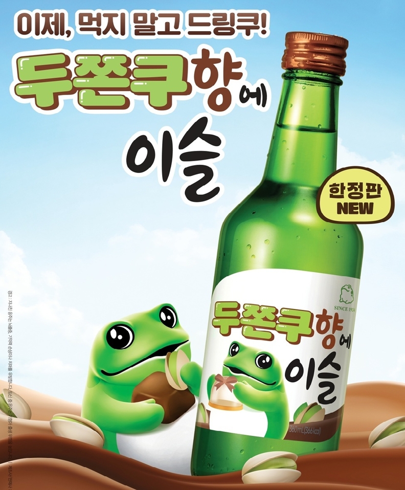이번에 출시한 ‘두쫀쿠향에이슬’은 두쫀쿠(두바이 쫀득 쿠키) 특유의 초콜릿과 피스타치오 향미를 조화롭게 구현했다. 달콤하면서도 고소한 풍미를 살려 주류로 즐기는 두쫀쿠로 맛을 차별화했다.