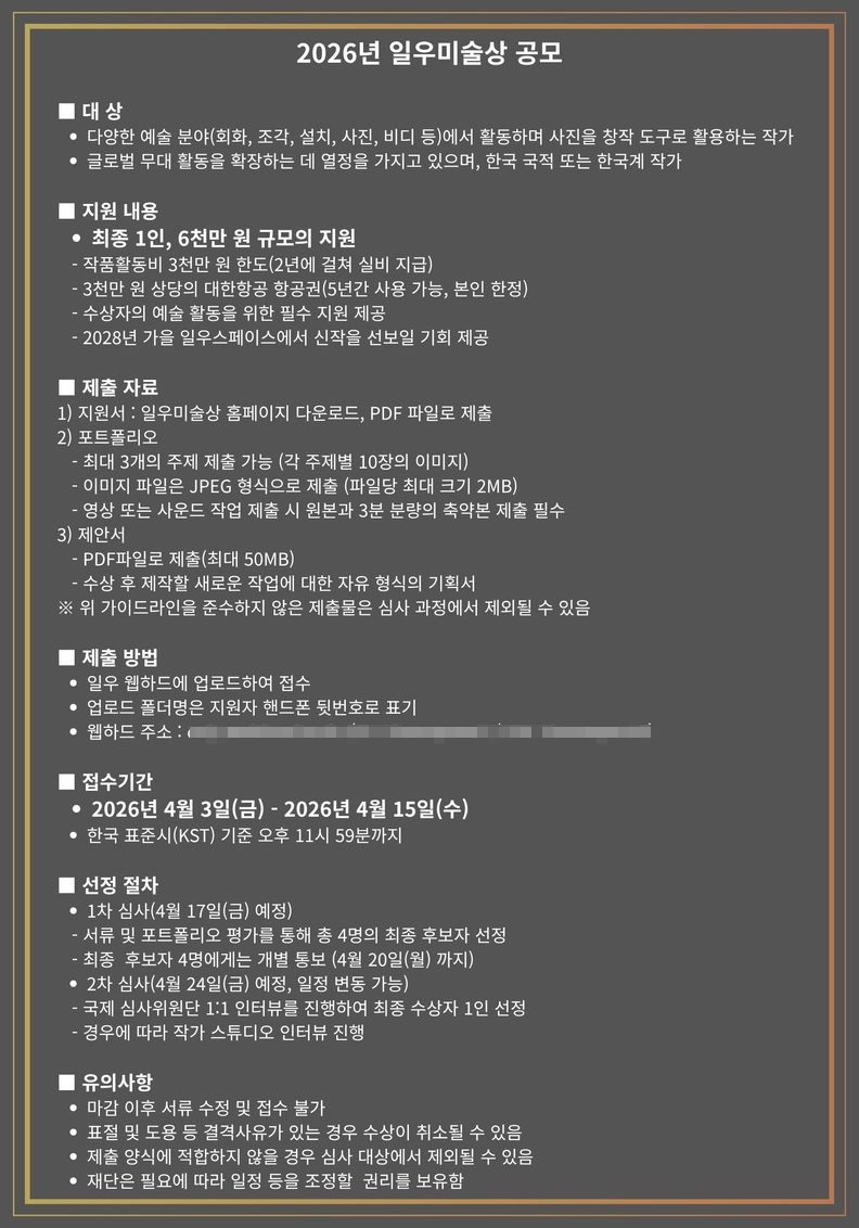 2026 일우미술상 공모에서는 총 1명을 최종 선정해 작품 제작 활동비 3천만원과 대한항공 항공권 3천만원 상당을 포함한 총 6천만원 규모의 지원을 제공한다. 또한 서울 중구 대한항공 서소문빌딩 내 전시 공간인 ‘일우스페이스’에서 개인전을 개최할 수 있는 기회도 주어진다.