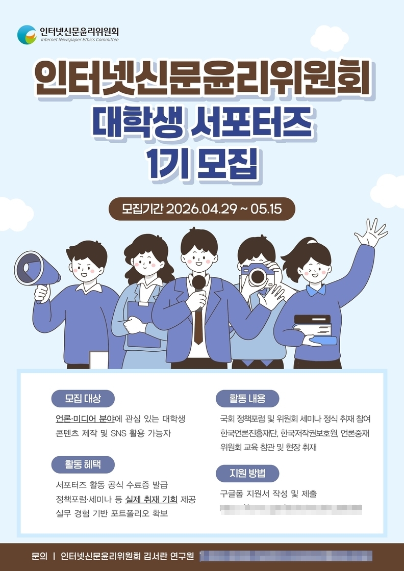 접수는 29일부터 오는 5월 15일까지 온라인으로 진행되며, 합격자는 5월 22일 발표된다. 활동 기간은 5월 말부터 약 6개월이다. 모집 대상은 언론·미디어 분야에 관심 있는 대학생으로, 콘텐츠 제작과 온라인 활동이 가능하면 지원할 수 있다. 참여자에게는 활동 지원비와 수료증이 제공된다.