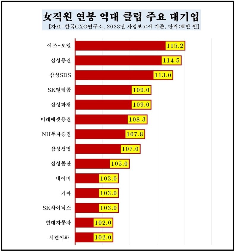 여직원 평균 연봉이 1억원 웃도는 연봉 ‘억대 클럽’ 기업도 14곳에 달했다. 조사대상 150개 기업중 ‘에쓰-오일’ 여직원 연봉이 1억1520만원으로 1위를 차지했다. 다음은 ▲삼성증권(1억 1450만원) ▲삼성SDS(1억 1300만원) ▲삼성화재·SK텔레콤(각 1억900만원) ▲미래에셋증권(1억790만원) ▲NH투자증권(1억780만원) ▲삼성생명(1억700만원) ▲삼성물산(1억500만원) ▲기아·SK하이닉스·네이버(각 1억300만원) ▲현대차·서연이화(각 1억200만원) 등도 여직원 연봉이 1억을 넘어섰다.