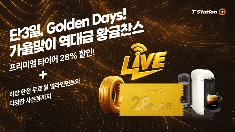 행사 기간, ‘골든 찬스’ 혜택을 통해 티스테이션닷컴 고객 모두에게 행사 제품 28% 할인 쿠폰이 제공된다. 정품 보증 및 전문 서비스로 믿을 수 있는 타이어 교체 문화 확산을 취지로 진행중인 ‘올바른 타이어 캠페인’ 응원 참여 고객에게는 행사 제품 4개 구매 시 중복 적용 가능한 1만 원 할인 쿠폰, 신한카드 사전 신청 고객에 한하여 지정 카드로 10만 원 이상 결제 시 10만 원의 캐시백 혜택도 누릴 수 있다.