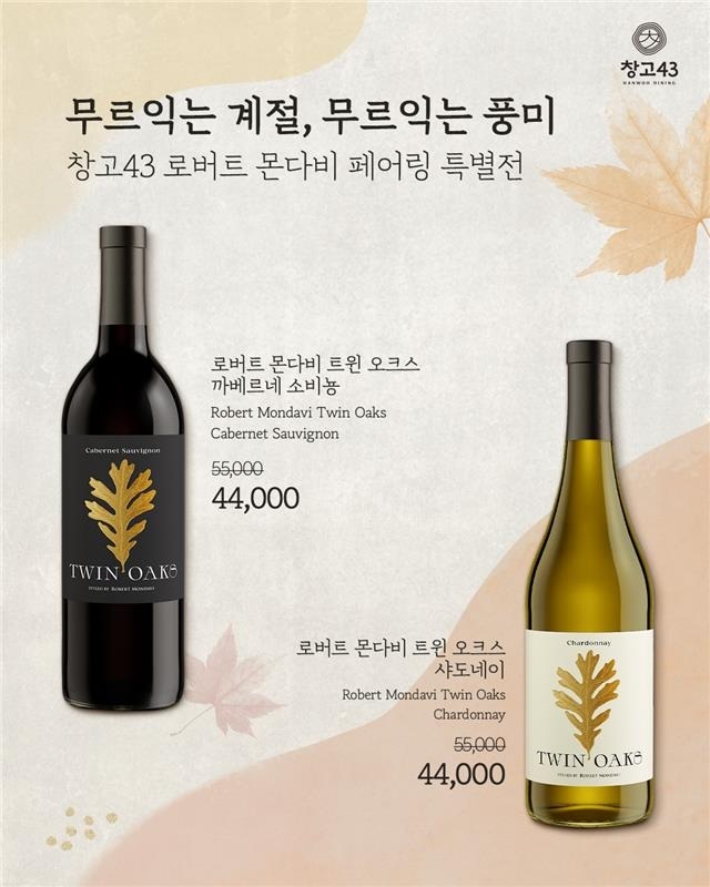 [서울타임즈뉴스 = 서연옥 기자] 다이닝브랜즈그룹 창고43이 가을에 어울리는 특별한 미식 경험을 제공하기 위해 ‘로버트 몬다비 페어링 특별전’을 진행한다. 로버트 몬다비 와인 ‘트윈 오크스 까베르네 소비뇽’과 ‘트윈 오크스 샤도네이’ 2종을 20% 할인된 가격인 44,000원에 즐길 수 있다. 해당 프로모션은 오는 11월 30일까지 창고43 전 매장에서 진행된다.