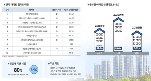 부동산시장 분석업체 부동산인포에 따르면 올 상반기 청약통장이 많이 몰렸던 평균 청약 경쟁률 상위 ‘톱 10’을 조사한 결과, 경쟁률 높았던 상위 10곳 중 8곳이 분상제 적용 단지였다. 서울 ‘래미안 원페를라’ 151.6대 1가 1위를 기록했고, 충북 ‘청주테크노폴리스 아테라 2차’가 1순위 평균 109.6대 1로 2위를 차지했다.