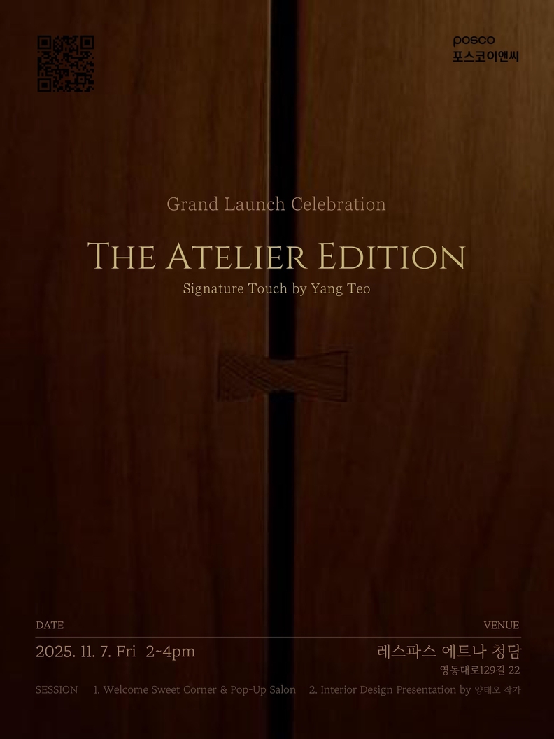 [서울타임즈뉴스 = 서연옥 기자] 포스코이앤씨(사장 송치영)는 양태오 작가와 함께 개발한 하이엔드 인테리어 상품 ‘아틀리에 에디션(The Atelier Edition)’을 오는 11월 7일 서울 레스파스 에트나 청담에서 런칭 행사를 열고 공식 공개한다.