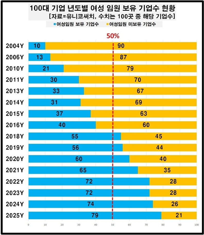 유리천장 속에서도 여성 임원을 배출시킨 기업은 점점 늘어나는 추세다. 100대 기업 내 여성 임원을 보유한 기업 숫자는 올해 79곳으로 작년보다 5곳 많아지면서 역대 최다를 기록했다. 여성 임원 보유 기업 수는 2004년 10곳→2006년 13곳→2010년 21곳으로 조금씩 늘었다. 이후 2011년 30곳→2013년 33곳→2015년 37곳→2016년 40곳→2018년 55곳→2019년 56곳→2020년 60곳→2021년 65곳으로 확대됐다. 2022년과 2023년에는 72곳, 2024년에는 74곳으로 늘더니 올해는 전년보다 5곳 더 많아졌다.