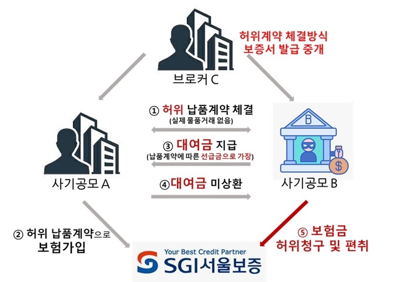 이번 사건에서 업체 A는 자금난을 해소하기 위해, 대여금 수익을 노린 업체 B와 공모해 허위 물품공급계약을 체결한 뒤 진성 거래로 위장해 SGI서울보증의 보증서를 발급받았다. 이후 B는 이를 담보로 A에게 선금 명목의 대여금을 지급했으나, 상환 기일이 도래하자 A가 이를 갚지 못하면서 B는 SGI서울보증에 보험금 지급을 청구하는 방식으로 손실을 보전하려 했다.