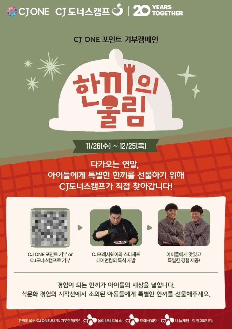 이번 캠페인은 11월 26일부터 12월 25일까지 CJ도너스캠프 홈페이지 또는 CJ ONE 앱에서 ‘한끼의 울림’ 배너를 통해 CJ ONE 포인트나 신용카드∙휴대폰 결제 등으로 참여할 수 있다.