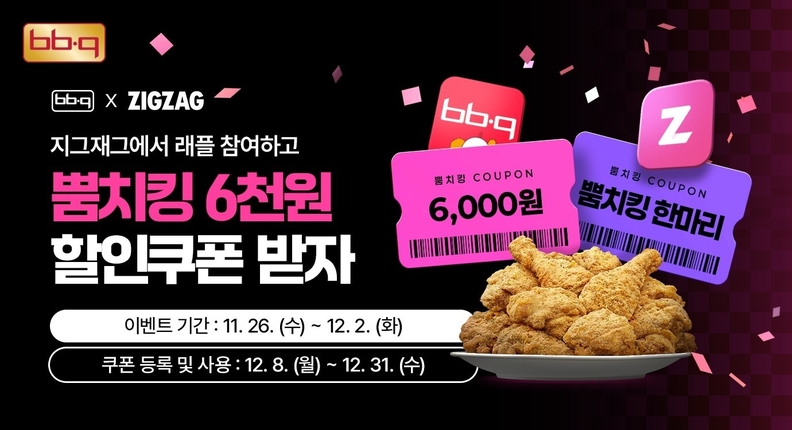 지그재그 앱 내 ‘BBQ 래플’ 페이지에서 12월 2일까지 응모 가능하며, 결과는 3일 발표된다. 추첨을 통해 50명에게 뿜치킹 한 마리 쿠폰을 제공하고, 응모한 모든 고객에게 6,000원 할인 쿠폰이 지급된다. 당첨 쿠폰은 BBQ앱에 등록해 12월 31일까지 사용할 수 있다.