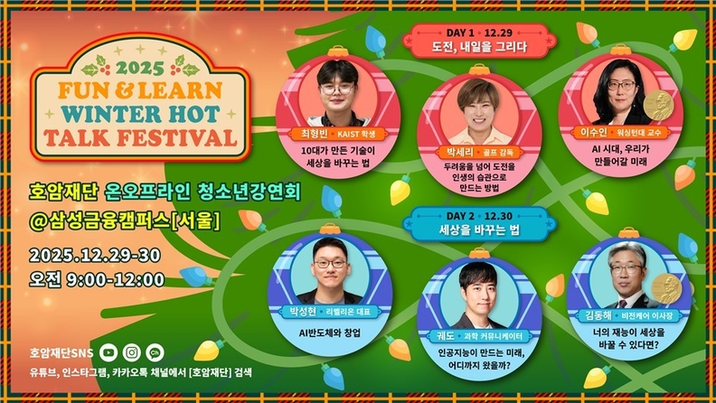 [서울타임즈뉴스 = 최남주 기자] 호암재단(이사장 김황식)은 청소년 특화 강연 프로그램인 ‘펀앤런, 2025 윈터 핫 톡 페스티벌’을 오는 12월 29일부터 30일까지 이틀간 서울 서초구 삼성금융캠퍼스에서 현장과 온라인 병행 방식으로 개최한다.