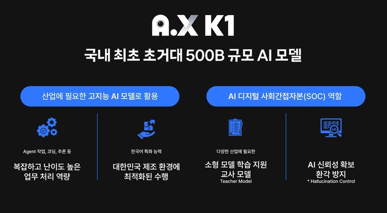 A.X K1은 처음부터 한국어 기반으로 학습된 모델이라는 점에서도 차별화된다. 영어 중심으로 설계된 기존 글로벌 모델과 달리 한국어 입력을 자연스럽게 이해하며, 한국의 문화·경제·역사적 맥락을 반영한 국민 맞춤형 서비스 구현에 적합하다.