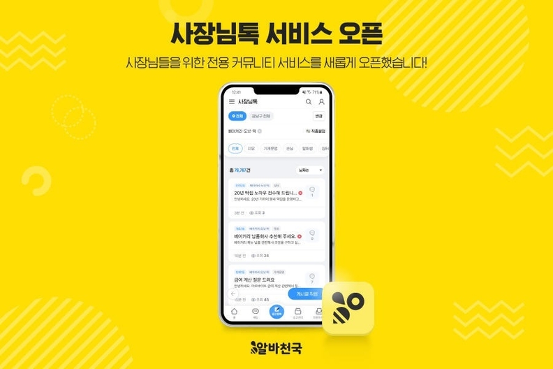 [서울타임즈뉴스 = 서연옥 기자] 구인·구직 아르바이트 전문 포털 알바천국(대표이사 우태경)이 사장님 커뮤니티 서비스 '사장님톡'을 오픈했다. 이번 서비스 출시로 알바천국은 개인회원과 기업회원 모두 이용 가능한 커뮤니티 서비스 라인업을 구축했다.