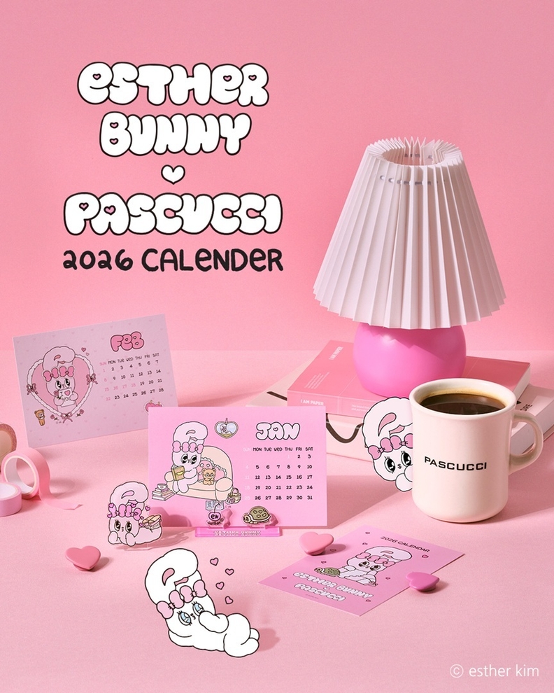 이 캐릭터는 따뜻한 메시지와 사랑스러운 디자인으로 MZ세대의 높은 인기를 얻고 있다. 파스쿠찌의 에스더버니 캘린더는 엽서형 캘린더와 아크릴 스탠드로 구성됐으며, 에스더버니 특유의 핑크 컬러와 키치한 감성을 담아 일상 속 소소한 설렘을 전한다.