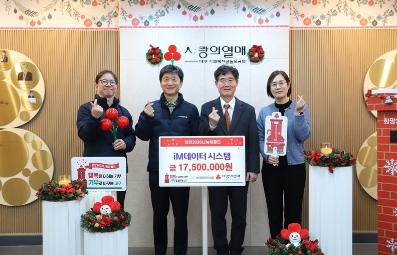 [서울타임즈뉴스 = 최남주 기자] iM금융그룹 IT전문 계열사인 iM데이터시스템(대표이사 유충식)은 대구사회복지공동모금회(회장 신홍식)에 이웃사랑성금을 전달하며 ‘희망 2026나눔캠페인’에 동참했다고 30일 밝혔다.