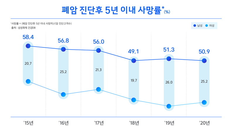 삼성화재 분석 결과, 남성 환자의 사망 위험이 상대적으로 높은 것으로 확인됐다. 2015년부터 2020년 사이 폐암 진단 환자의 5년 이내 사망률을 살펴본 결과, 남성은 53.0%로 남녀 전체 평균인 44.3%를 크게 웃돌았다. 이는 여성 평균 29.6%와 비교하면 약 1.8배 높은 수치다.