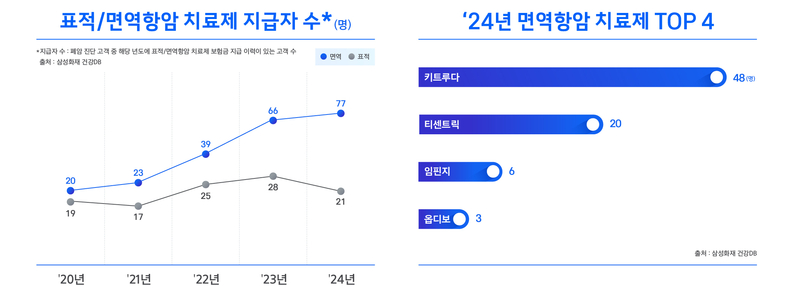 전문가들은 이러한 변화의 배경으로 표적항암제와 면역항암 치료 확대를 꼽는다. 삼성화재 데이터에서도 면역항암 치료 보험금 지급 사례는 2020년 20명에서 2024년 77명으로 약 4배 증가했으며, 환자 맞춤형 치료를 위한 유전자 검사 역시 같은 기간 102명에서 165명으로 늘었다.