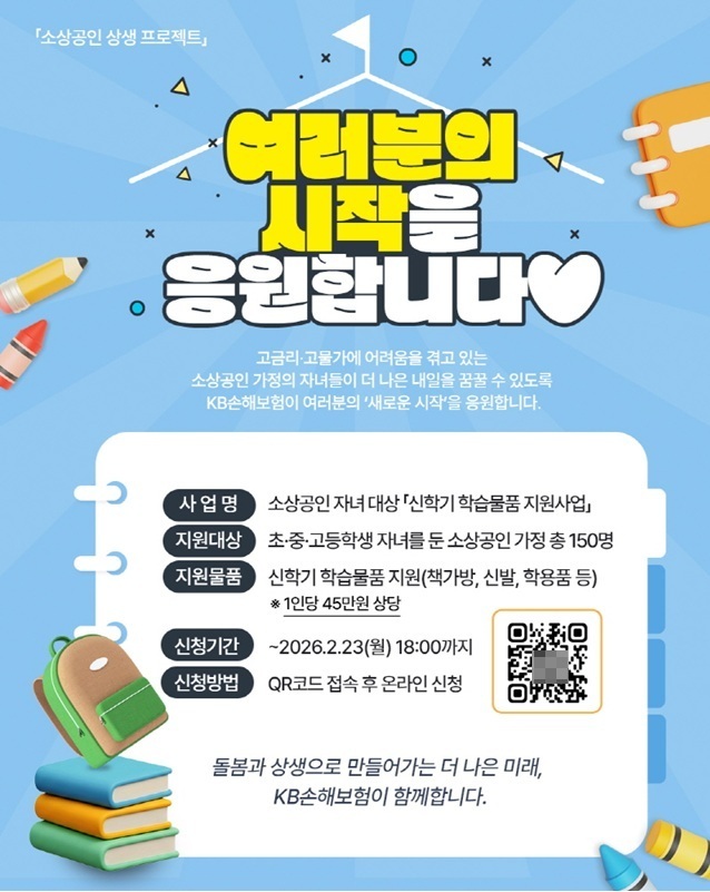 KB손해보험 관계자는 “이번 신학기 학습물품 지원사업을 통해 영세 소상공인 가정의 부담을 덜고, 아이들이 희망찬 새 학기를 시작할 수 있기를 바란다”며, “앞으로도 지역사회와 함께하는 돌봄과 상생의 가치를 바탕으로 사회적 책임을 지속적으로 실천해 나가겠다”고 밝혔다.
