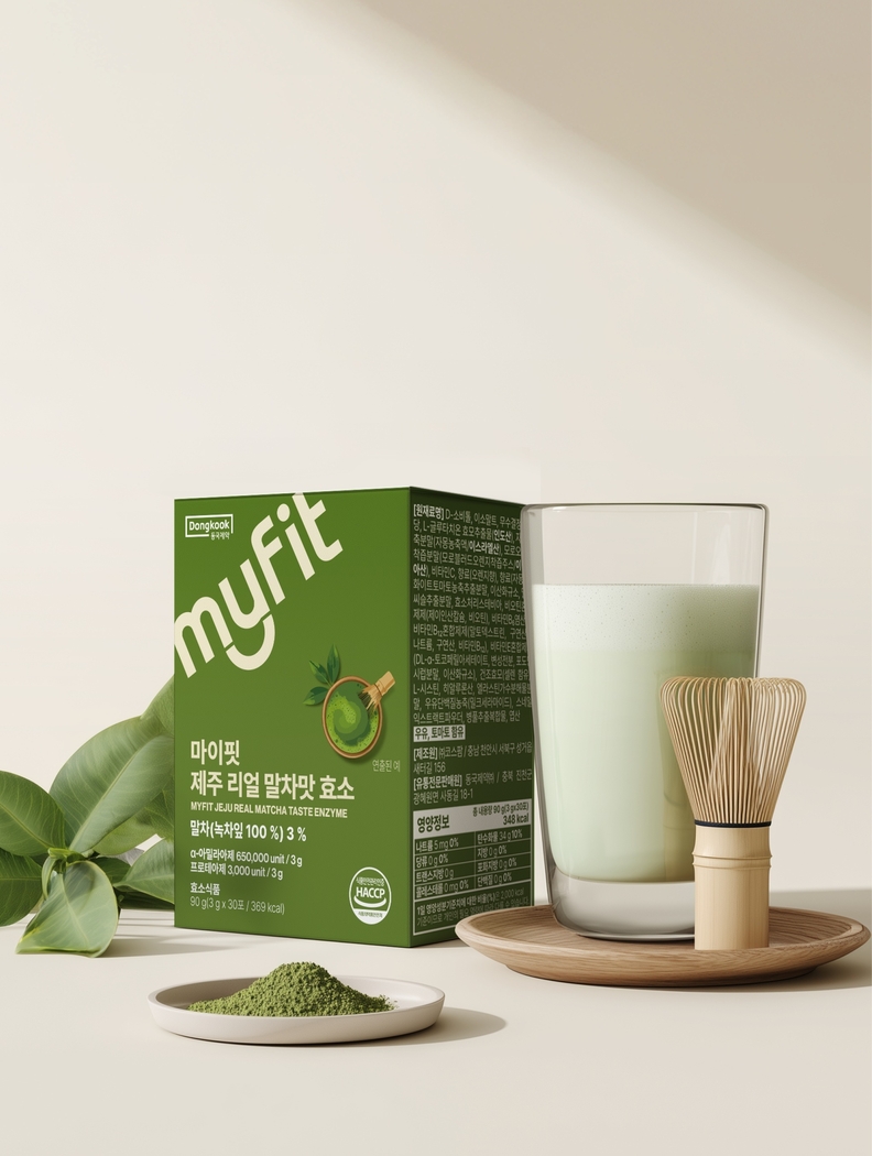 ‘마이핏 제주 리얼 말차맛 효소’는 15곡 발효 효소분말을 사용해 풍부한 곡물 영양을 함유한 제품으로, 한국인 대상 맞춤 고함량 역가 설계가 특징이다. 동국제약 효소 라인업 중 가장 높은 수준의 역가수치인 1포당 총 역가수치 653,000유닛(unit)으로 설계되었으며, 탄수화물 분해 요소인 알파아밀라아제의 활성 수치를 더 높게 설정하고 단백질 분해 요소인 프로테아제를 균형 있게 구성했다.