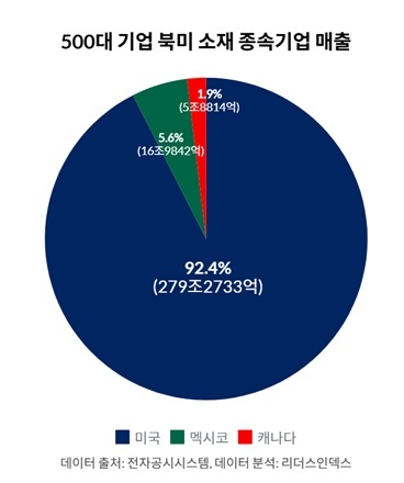 기업분석연구소 리더스인덱스가 매출 상위 500대 기업 가운데 2025년 3분기 보고서를 제출하고 북미 지역 매출을 별도 공시한 67개사와 이들 종속기업 194곳을 분석한 결과, 이들의 북미 매출은 2024년 3분기 누적 301조2222억원에서 2025년 3분기 343조7985억원으로 14.1% 증가했다. 같은 기간 전체 매출 증가율은 8.0%에 그쳐 북미 시장의 성장세가 상대적으로 두드러졌다. 전체 매출에서 북미가 차지하는 비중은 31.0%로 확대됐지만, 증가 폭은 전년 대비 다소 둔화됐다.
