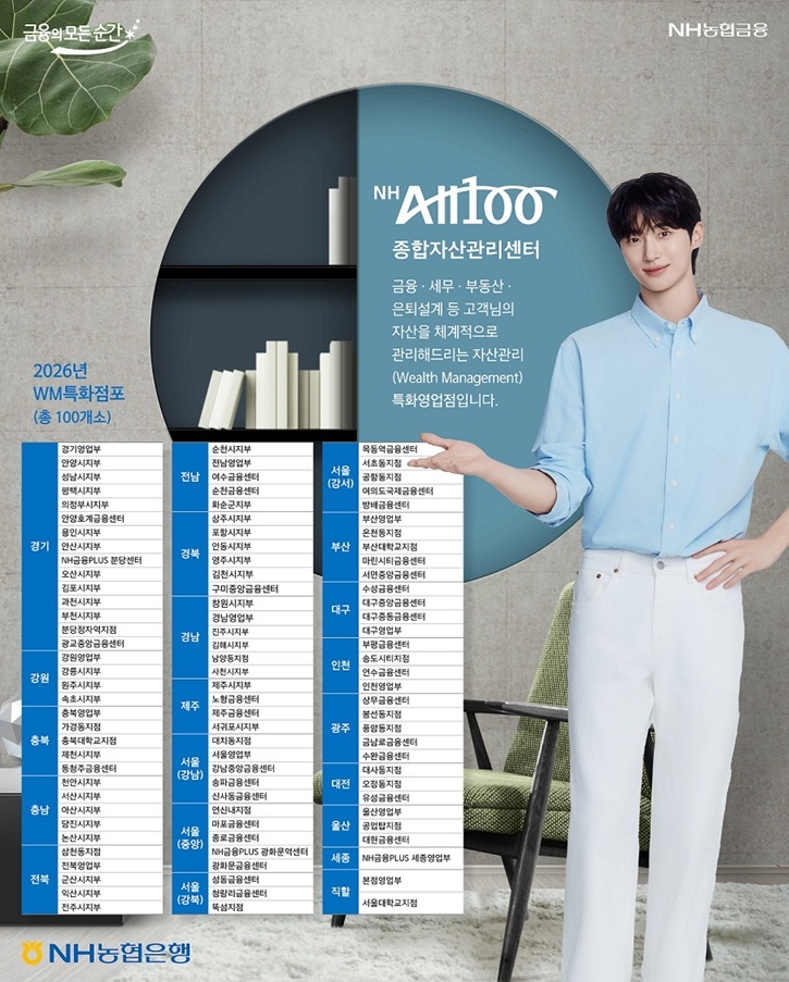 [서울타임즈뉴스 = 최남주 기자] NH농협은행은 지역에 밀착한 초개인화 자산관리 서비스를 제공하기 위해 WM특화점포인 ‘NHAll100종합자산관리센터’를 전국 100개소로 확대했다고 10일 밝혔다. 이번 확대를 통해 수도권 39개소, 비수도권 61개소에 거점 점포를 구축하며 지역 기반 자산관리 체계를 한층 강화했다.