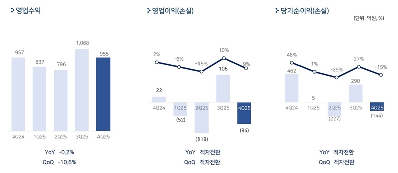 [서울타임즈뉴스 = 최명진 기자] 펄어비스가 12일 실적 발표를 통해 2025년 연결 기준 4분기 매출 955억원, 영업손실 84억원, 당기순손실 144억원을 기록했다고 밝혔다. 4분기 매출은 전분기 대비 10.6%, 전년 동기대비 0.2% 감소했다. 영업이익과 순이익 등 모두 적자 전환했다.