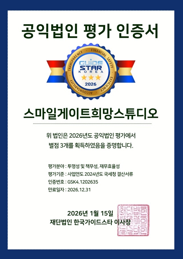 [서울타임즈뉴스 = 최명진 기자] 스마일게이트 희망스튜디오는 한국가이드스타의 2026년도 공익법인 평가에서 ‘투명성’, ‘책무성’, ‘재무효율성’ 전 부문 만점을 받아 별점 3개의 스타공익법인으로 선정됐다고 19일 밝혔다.