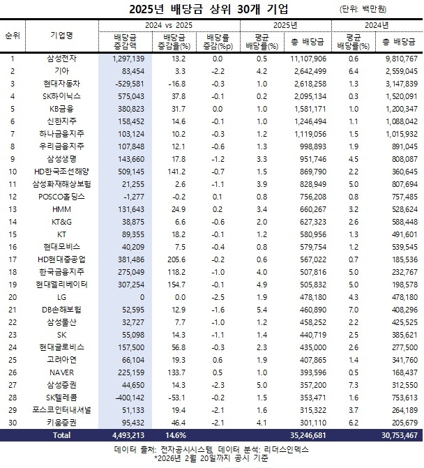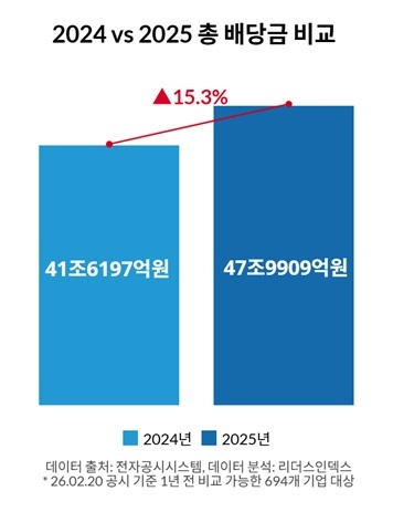 24일 기업분석기관 리더스인덱스가 국내 상장사 2651곳 중 2월 20일까지 현금·현물배당 공시를 완료하고 전년도와 비교 가능한 694개사의 2024·2025년도 배당 현황을 분석한 결과, 이들 기업의 전체 배당금은 41조6197억원에서 47조9909억원으로 15.3%(6조3712억원) 증가했다.