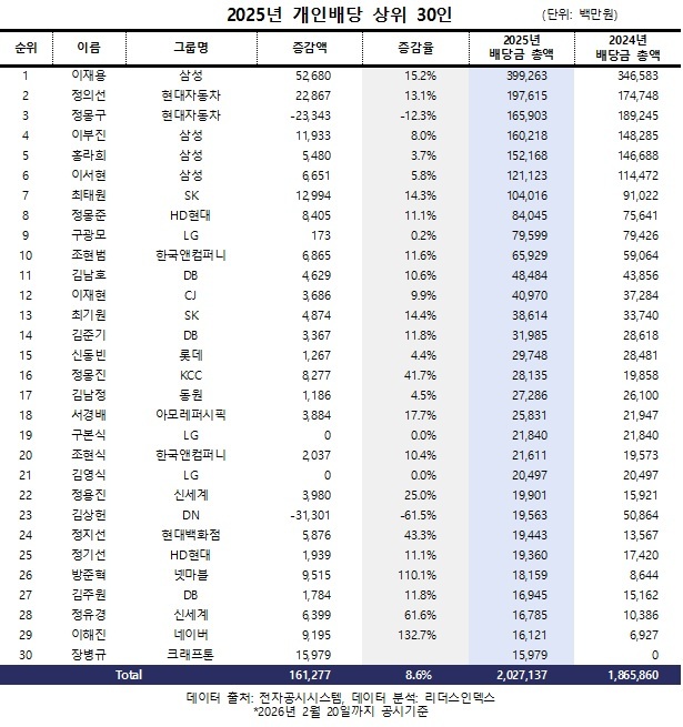 개인 배당 순위에서는 이재용 삼성전자 회장이 3993억원으로 1위를 지켰다. 전년 대비 15.2% 증가하며 4000억원에 육박했다. 정의선 현대자동차그룹 회장은 1976억원으로 13.1% 늘며 처음으로 개인 배당 2위에 올랐다. 반면 정몽구 명예회장은 12.3% 감소해 상위 10인 중 유일하게 배당이 줄었다.
