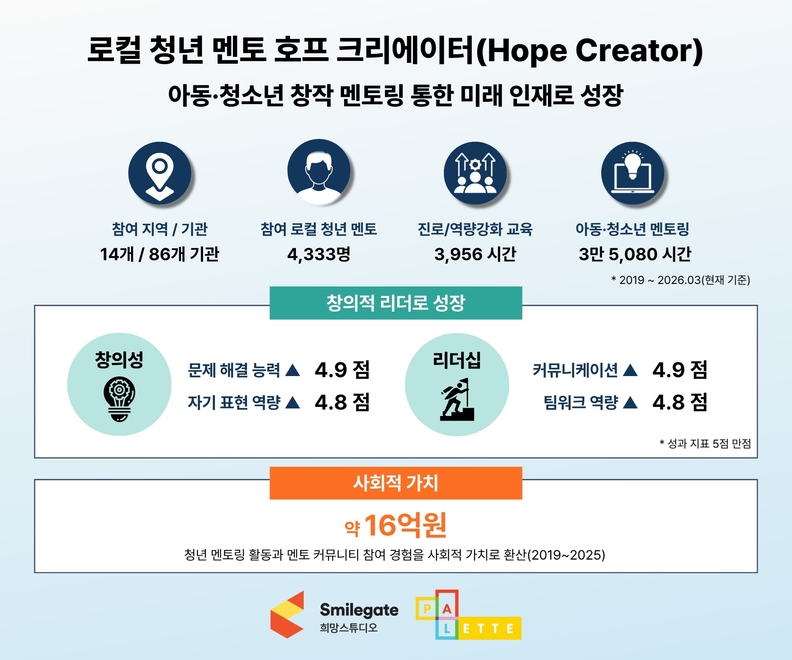 [서울타임즈뉴스 = 최명진 기자] 스마일게이트 희망스튜디오(이하 희망스튜디오, 이사장 권혁빈)는 창의 커뮤니티 ‘팔레트’의 청년 멘토 ‘호프 크리에이터 6기’가 활동을 마쳤다고 27일 밝혔다. 팔레트는 AI 등 IT 기술을 활용한 창작 교육을 지원하는 프로그램으로, 미래세대의 디지털 창의 역량을 키우는 데 초점을 맞추고 있다.