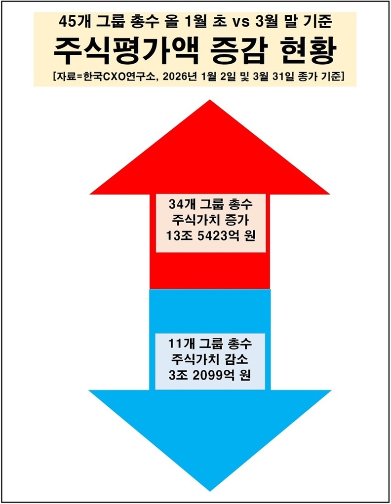 2일 기업분석전문 한국CXO연구소가 3월 말 기준 주식평가액이 1000억 원 넘는 그룹 총수(総帥) 45명을 대상으로 분석한 ‘2026년 1월 초 대비 3월 말 기준 1분기 주요 그룹 총수 주식평가액 변동 조사’에서 이같은 결과나 나왔다.