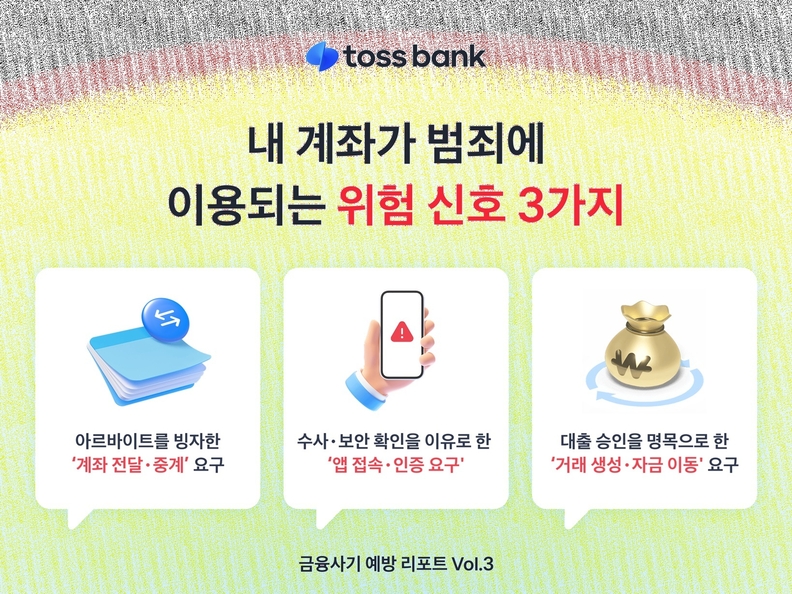 토스뱅크는 예방을 위한 핵심 위험 신호로 ▲아르바이트 등을 빙자한 개인 계좌 간 자금 전달 요구 ▲수사기관·금융기관을 사칭한 인증 및 이체 요구 ▲대출 승인 명목의 자금 이동 지시 등을 제시했다.