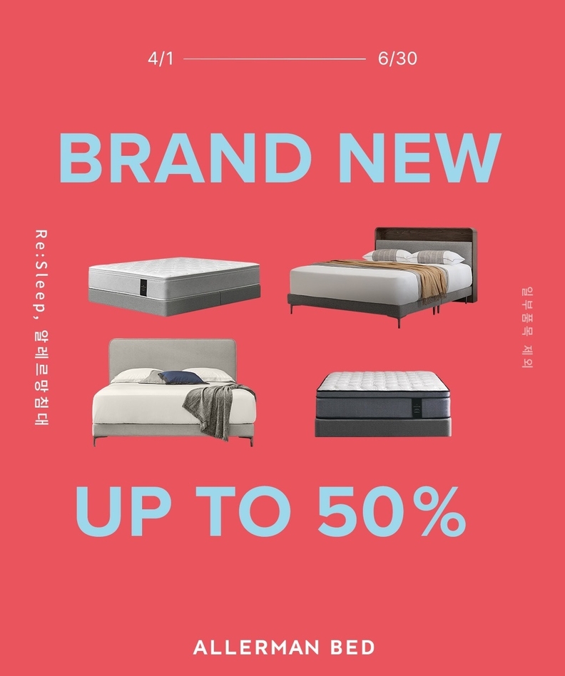 7일 관련업계에 따르면 알레르망 침대는 오는 6월 30일까지 전국 매장에서 ‘BRAND NEW 프로모션’을 실시하고 주요 매트리스와 프레임 제품을 할인 판매한다. 대표 제품인 ‘프리미엄 1840’과 ‘레스터’ 매트리스는 50% 할인, 기타 매트리스는 30% 할인 혜택을 적용한다.