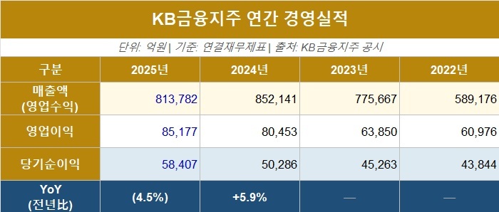 15일 금융감독원 전자공시시스템 데이터에 따르면 KB금융지주의 2025년 영업수익은 81조3782억원, 영업이익은 8조5177억원, 당기순이익은 5조8407억원으로 집계됐다. 이는 전년 영업수익 85조2141억원, 영업이익 8조453억원, 당기순이익 5조286억원과 비교하면 매출은 줄고 영업이익과 당기순이익은 증가한 수준이다. 내실경영에 집중한 결과로 풀이되는 수치 흐름이다. 이처럼 KB금융은 2022년 이후 이익 규모가 꾸준히 확대되며 안정적인 성장 흐름을 이어가는 모습이다.