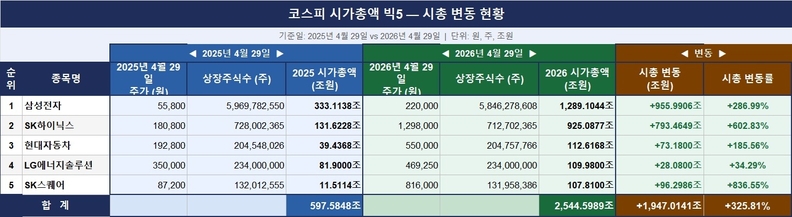 29일 한국거래소(KRX) 자료를 바탕으로 삼성전자·SK하이닉스·현대자동차·LG에너지솔루션·SK스퀘어 등 시총 상위 5개사(삼성전자 우량주 제외)의 주가와 상장주식 수를 반영해 단순 계산한 결과, 이들 기업의 합산 시가총액은 약 2544조원으로 집계됐다. 같은 방식으로 2025년 4월 29일 종가 기준 약 597조원이었던 것과 비교하면 1년 새 약 1947조원이 늘어난 규모다.