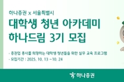 [서울타임즈뉴스 = 최남주 기자] 하나증권(대표이사 강성묵)은 오는 24일까지 ‘하나드림’ 3기를 모집한다고 13일 밝혔다. 올해로 3기를 맞이하는 ‘하나드림’은 하나증권이 증권사 취업에 관심이 있는 대학생들을 대상으로 진행하는 투자 아카데미이다. 참가한 학생들은 하나증권 멘토를 통해 증권사에서 하는 업무와 현장의 이야기를 들을 기회가 주어지고 모의투자대회로 다양한 투자 경험도 쌓을 수 있다. ‘하나드림’은 10월 31일 첫 강연을 시작으로 12월 3일 수료식까지 6주간 매주 금요일마다 개최된다. 아카데미에서는 서울시가 주관하는 ‘영테크 2.0’이라는 금융 교육 프로그램이 같이 진행된다. ‘영테크 2.0’은 사회초년생들과 청년들이 반드시 알아야 할 금융 지식들을 담았다. 서울시가 청년들에게 금융 교육을 제공하는 일환으로 하나증권과 업무 협약을 맺고 준비한 프로젝트이다. ‘하나드림’ 3기를 수료한 대학생 가운데 이수 조건을 충족하면 하나증권이 수료증을 발급한다. 아카데미 참여 우수자에게는 상금과 더불어 하나증권 입사 지원 시 서류전형에서 우대 가점이 부여되는 등 혜택이 제공된다. 또한 ‘영테크 2.0’을 일정 부분 이수한 수강자에게 서울시가 별도의 수료증을 발