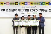 [서울타임즈뉴스 = 최남주 기자] KB국민은행(은행장 이환주)과 한국체육산업개발㈜(대표이사 신치용)이 ‘KB 조이올팍 페스티벌’의 수익금 전액을 사회 취약계층 지원과 환경 보호를 위해 기부했다. 이번 기부금은 KB국민은행과 함께 페스티벌을 공동 주최한 한국체육산업개발㈜의 티켓 판매 수익금으로 마련됐으며, 총 기부액은 1억 2,600만원에 달한다. 기부금은 ▲서울특별시 자립지원전담기관 ▲환경재단 ▲서울환경연합에 전달되어 자립준비청년 지원과 환경 보호 활동 등 다양한 사회공헌 사업에 사용될 예정이다. 24일 서울 올림픽공원에서 열린 기부금 전달식에는 신치용 한국체육산업개발㈜ 대표이사, 최영식 서울환경연합 이사장, 정태용 환경재단 사무처장, 한성은 서울특별시 자립지원전담기관 실장, 김경남 KB국민은행 ESG본부장 등 각 기관 관계자들이 참석했다. ‘KB 조이올팍 페스티벌’은 KB국민은행과 한국체육산업개발㈜이 공동 주최한 대규모 야외 음악축제다. ‘KB 조이올팍 페스티벌’은 지난 9월 20일부터 21일까지 서울 올림픽공원 88잔디마당에서 개최됐다. 페스티벌은 ESG 실천을 위한 친환경 축제로 기획되어, 전 구역에 다회용기를 사용하고 쓰레기 분리를 돕는 안내 요원을