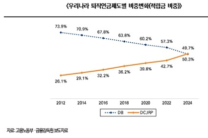 이런 가운데 미래에셋투자와연금센터가 7일 ‘퇴직연금 도입 20년, DB형에서 DC형으로의 머니무브가 시작됐다’는 제목의 리포트를 발간해 주목된다. 이번 보고서는 임금 구조 변화와 제도 개선이 DC형 확산의 핵심 요인이라고 진단했다.