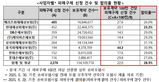 사업자별로는 메리츠화재가 465건으로 피해구제 신청이 가장 많았고 현대해상(452건), DB손해보험(359건)이 뒤를 이었다. 보유계약 100만 건당 신청 건수는 흥국화재가 44.3건으로 가장 높았다. 주요 8개 손해보험사의 평균 합의율은 28.3%였고, 사업자별로는 삼성화재가 31.1%로 가장 높은 반면 현대해상은 23.2%로 최저였다.