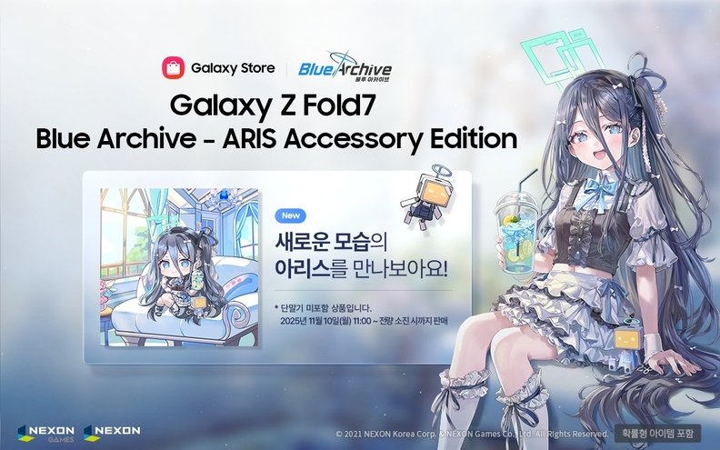 [서울타임즈뉴스 = 최태호 기자] ㈜넥슨(공동 대표 강대현∙김정욱)은 10일 서브컬처 게임 ‘블루 아카이브’가 ‘갤럭시 스토어’와 협업한 ‘갤럭시 Z 폴드7 아리스 액세서리 에디션’을 출시한다고 밝혔다. 지난 ‘갤럭시 S24 울트라 블루 아카이브 에디션’에 이어 두 번째로 선보이는 '갤럭시 스토어' 협업 시리즈로, ‘블루 아카이브’의 인기 캐릭터 ‘아리스’를 콘셉트로 한 다채로운 굿즈와 갤럭시 스마트폰 전용 '아리스' 테마로 구성됐다.