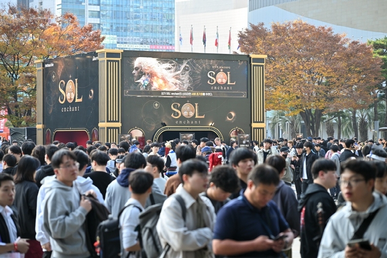 야외 부스를 마련한 <SOL: enchant(솔: 인챈트)>는 미디어아트 영상이 영화와 같은 몰입감을 제공한다는 평가를 받으면서 관람객들로 인산인해를 이루고 있다. 또한 ‘지스타 2025’ 기간 중 공개된 티저 영상 역시 높은 퀄리티로 기대감을 이끌어내고 있다.