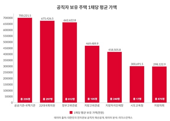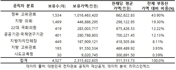 국회의원은 평균 1.41채였으며, 정당별로는 국민의힘 의원이 1.68채, 더불어민주당 1.33채, 조국혁신당 0.67채, 개혁신당·무소속·진보당 등 소수정당 및 무소속 의원은 평균 0.8채로 나타났다. 가액 기준으로는 정부 고위관료가 전체 공직자 주거용 부동산의 43.9%를 차지해 가장 큰 비중을 보였다. 국회의원만 놓고 보면 여야 차이가 뚜렷했다.