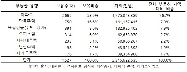 아파트, 단독주택, 복합건물(주택+상가), 오피스텔, 다세대주택, 연립주택, 다가구주택 등이 포함됐고 전세(임차)권은 제외했다. 공직자 주택 유형별 보유 현황 주택 유형별로는 아파트 비중이 단연 컸다. 전체 4527채 중 아파트는 2665채(58.9%)로 절반을 훌쩍 넘겼으며, 가액은 1조7750억원(76.7%)에 달했다. 이어 단독주택(16.6%), 복합건물(8.6%), 오피스텔(6.9%), 다세대·연립·다가구주택(합계 9.0%) 순이었다.