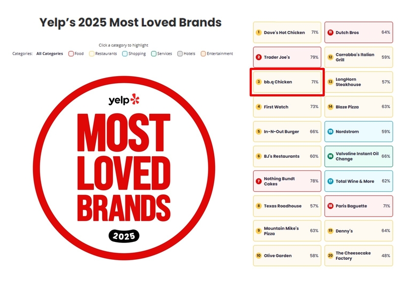 옐프는 500만 개 이상의 비즈니스 페이지가 등록돼 있으며, 구글 리뷰, 트립어드바이저 등과 함께 미국 시장에서 가장 영향력 있는 대표 리뷰 플랫폼으로 평가받고 있다. 이번 옐프가 발표한 ‘가장 사랑받는 브랜드’ 순위는 브랜드 평점, 재방문 고객 평가, 브랜드 검색량, 리뷰 수 등을 종합 분석해 선정됐다. BBQ는 이 평가에서 높은 소비자 만족도와 브랜드 호감도를 인정받으며 전체 3위에 올랐다.