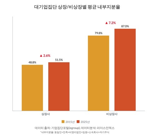 내부지분 확대는 상장사보다 비상장사에서 훨씬 강하게 나타났다. 비상장사의 내부지분율 상승폭은 7.2%p로, 상장사(2.7%포인트)의 약 3배에 달했다. 실제로 두산, 교보생명보험, KCC, 미래에셋, 현대백화점, 동국제강, 이랜드, 태영, 현대자동차, 태광 등 10개 그룹은 비상장사 내부지분율 증가폭이 두 자릿수에 이르렀다. 반면 상장사 가운데 두 자릿수 상승을 기록한 곳은 교보생명, 동국제강, 미래에셋, 현대백화점 등 4곳에 그쳤다.