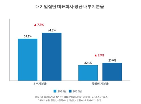 반면 소속회사(계열사)의 평균 지분율은 49.4%에서 56.8%로 7.4%p 상승했다. 이에 따라 동일인·친족·비영리법인·임원·소속회사·자기주식을 합친 내부지분율은 64.3%에서 67.7%로 3.4%p 높아졌다. 총수의 직접 지분은 줄었지만, 계열사 자본을 활용한 우호 지분 확대로 그룹 전체에 대한 내부 통제력은 강화된 셈이다.
